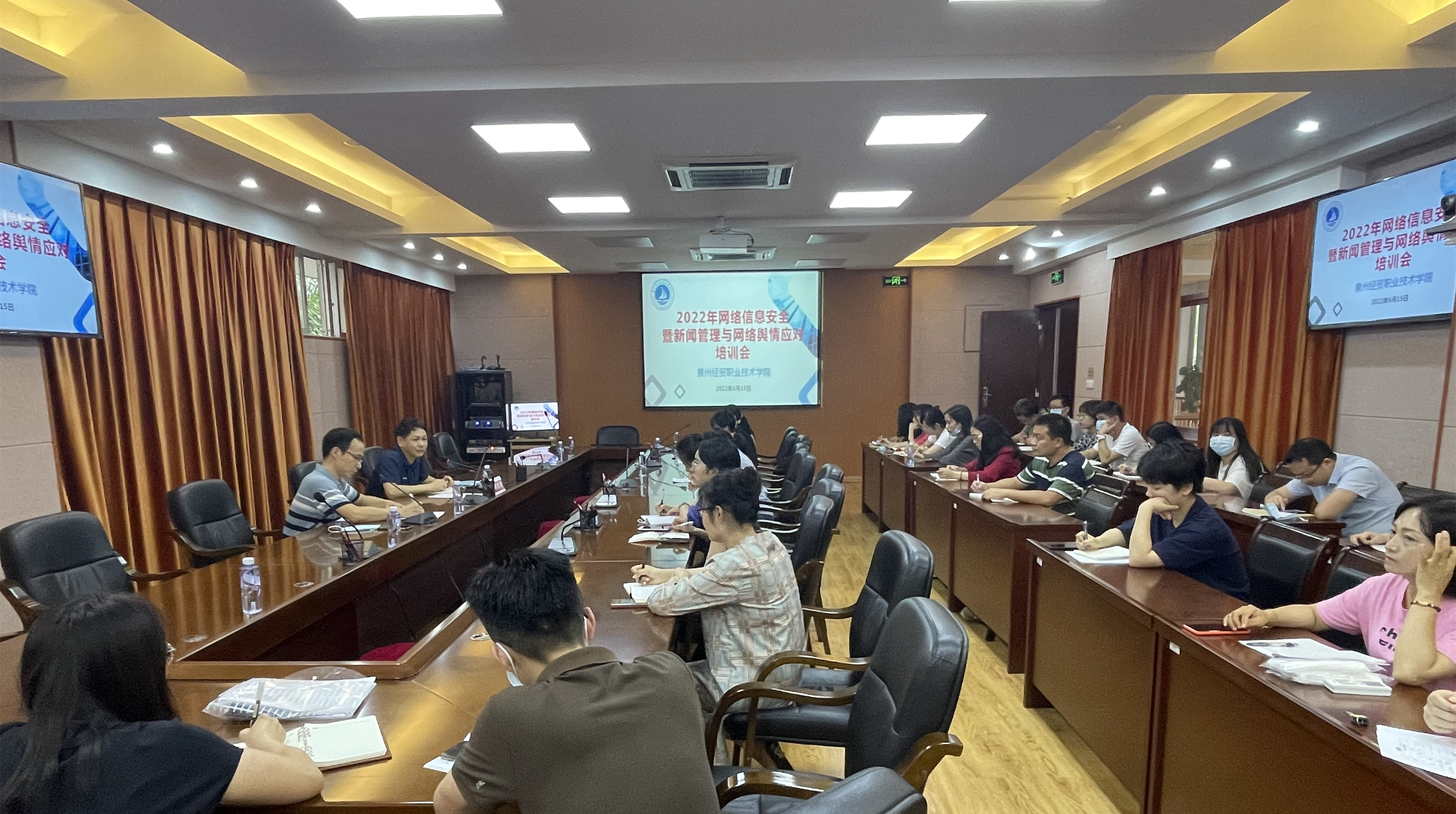 为进一步提升学院网络安全意识,加强网络安全教育宣传,营造安全健康文明和谐的网络环境,2022年6月15日下午,学院在行政楼二楼会议室开展网络信息安全暨新闻管理与网络舆情应对培训会,学院党委副书记陈金通主持会议,各处室、各系部等相关人员参加了会议。