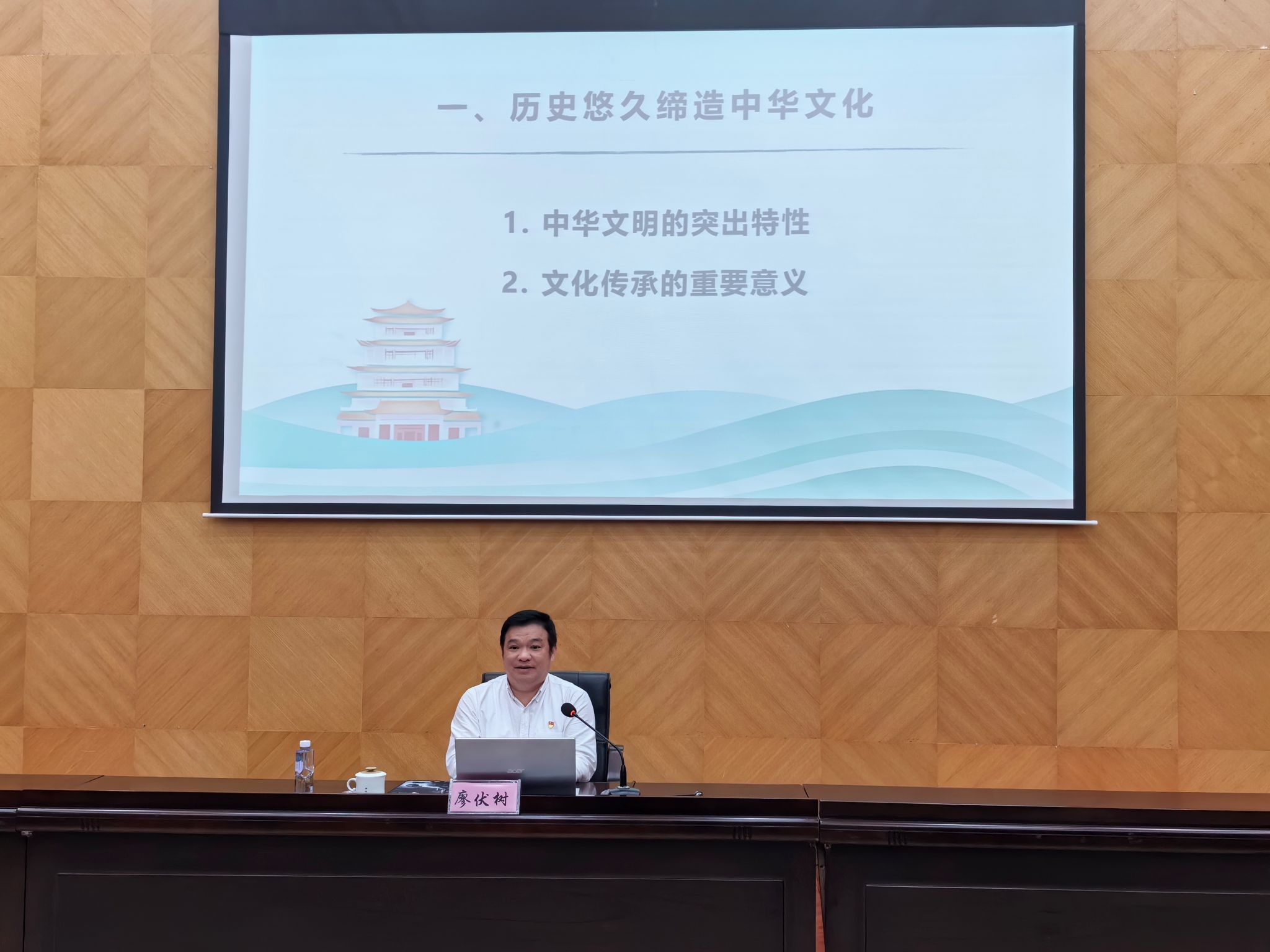 廖伏树从“历史悠久缔造中华文化”“培根铸魂推动文化繁荣”“笃定前行建设现代文明”三个方面进行讲解,通过讲故事、举例子,充分阐释中华文明五个突出特性的内涵和相互关系,深入阐明当前我国文化事业繁荣发展的现状和新时代的文化使命,深刻解读中华文化繁荣兴盛与中华民族伟大复兴的关系,案例丰富,生动有趣,激发了师生对中华传统文化的兴趣,不断深化了对中华文化的理解和认识,进一步引导师生坚定文化自信,担当使命 、奋发有为,共同为中华优秀传统文化创造性转化、创新性发展贡献自己的力量。