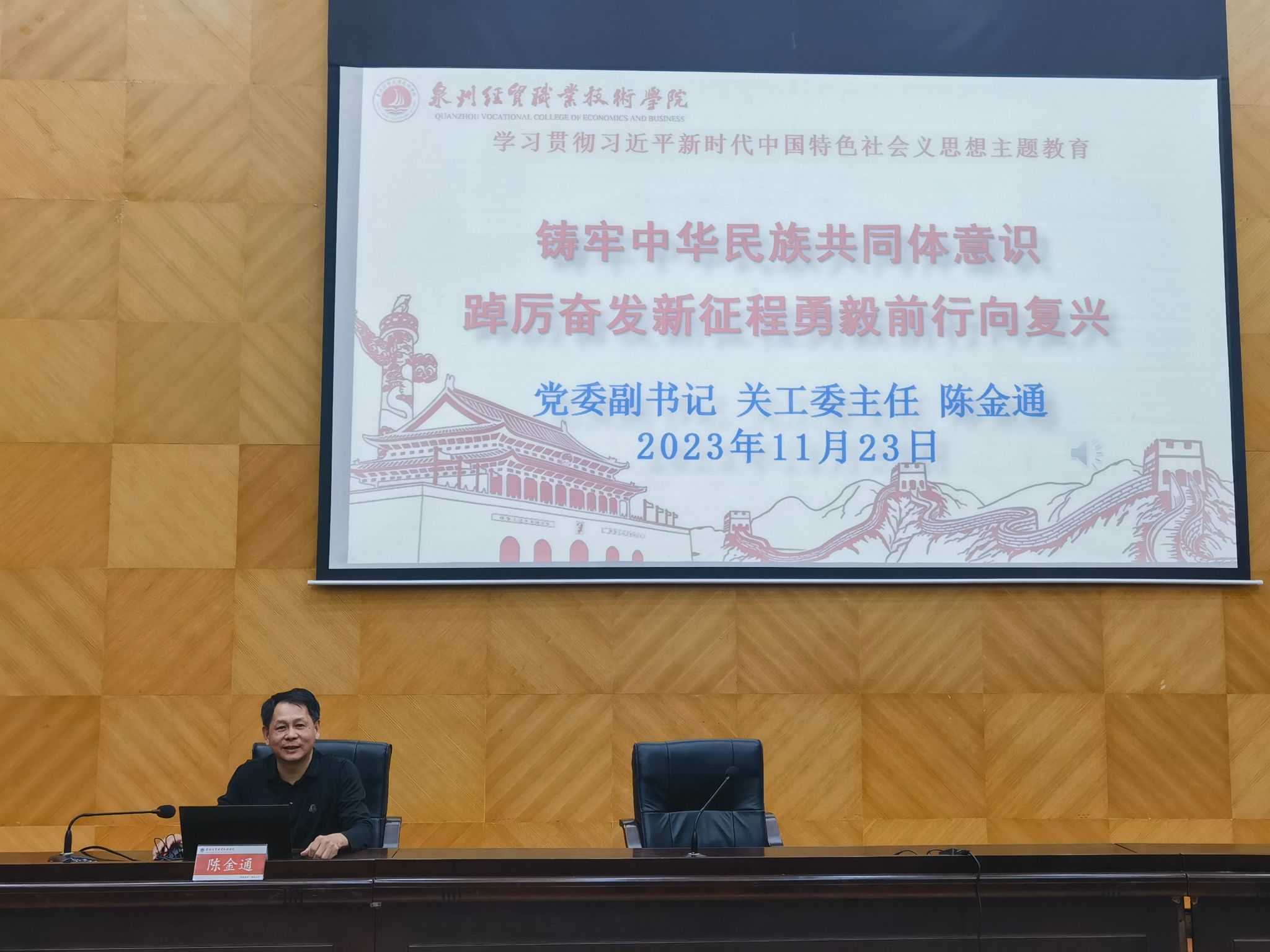 随着第二批主题教育的深入开展,11月23日晚,学院党委副书记、关工委主任陈金通在学术报告厅以“铸牢中华民族共同体意识,踔厉奋发新征程勇毅前行向复兴”为题讲授专题党课,学生处、团委、院系两级主要学生干部一百多人到场聆听。