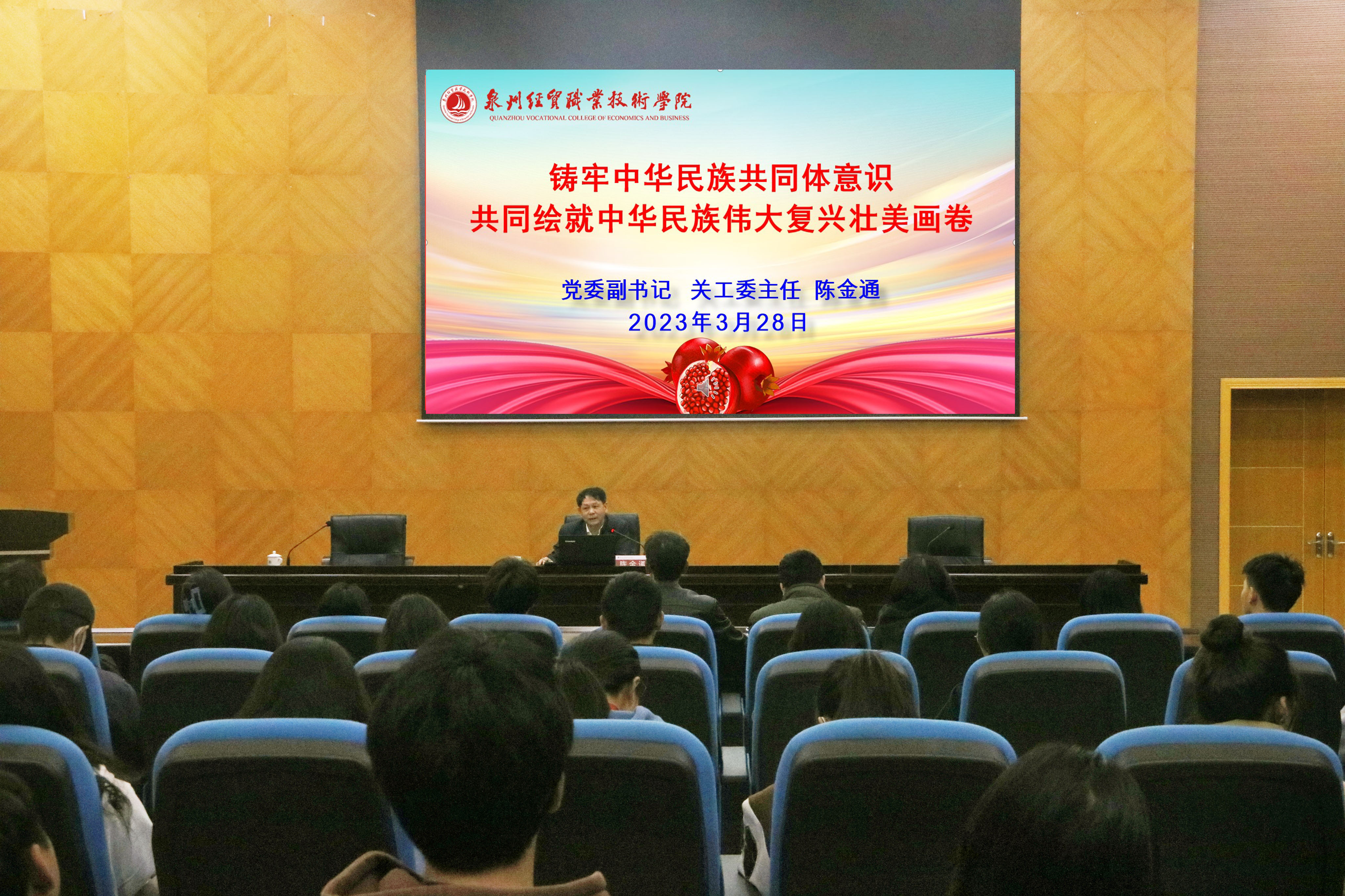 为让学生深入理解铸牢中华民族共同体意识的意义,推动新时代党的民族工作高质量发展,3月28日下午,学院关工委、团委联合在学术报告厅举行“铸牢中华民族共同体意识”专题讲座。讲座由学院党委副书记、关工委主任陈金通主讲,来自学院团委会、学生会、青协和各学生社团的近百名学生干部参加,学院关工委专职副主任高坤育主持。